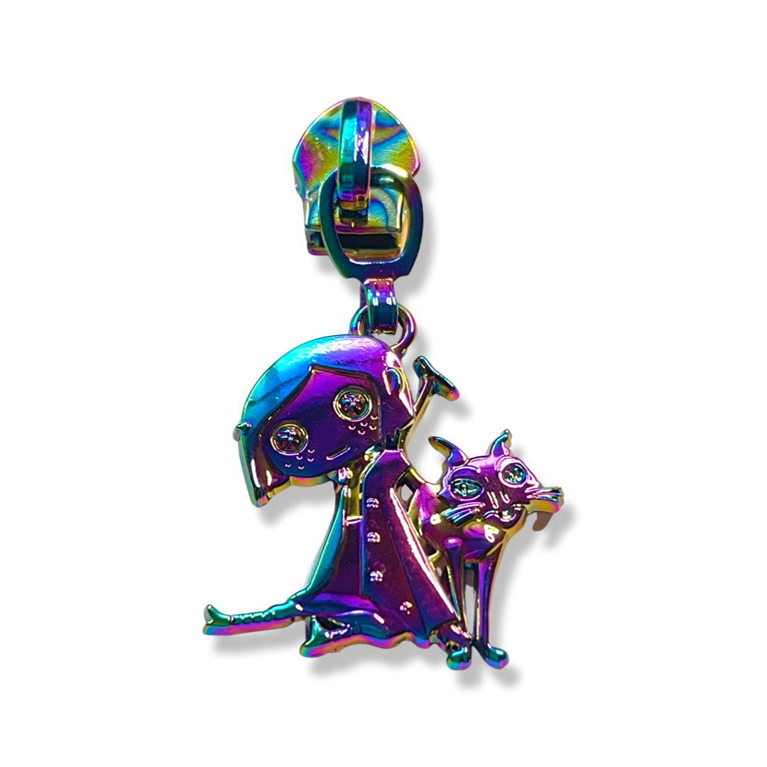 Zipper Pull, Coraline, Button Girl and Cat, Rainbow